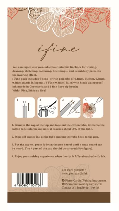 i-Fine pack includes 6 pens – 5 with pen nibs of 0.1mm, 0.3mm, 0.5mm, 0.8mm (made in Japan); 1 i-Fine (0.5mm) filled with black waterproof ink (made in Germany); and 1 fine fibre-tip brush.